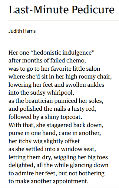 At another level, as the current era is one of narratives, this poem made me ponder whether it is time for us to try and change medicine’s narrative as well, especially in palliative patients or those with chronic debilitating conditions, from one of symptom alleviation or palliation to one which helps add more life to each day, and brings smiles rather than just remove tears. After all, if ‘Tender loving care’ is an acceptable prescription, why would ‘A trip to the beach’ or indeed a ‘Pedicure’ not be one?! Easier said than done of course, but perhaps food for thought.