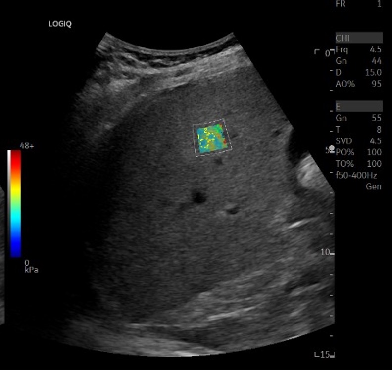 An ultrasound elastography study of the liver, with a colour-coded map of liver tissue stiffness in the region of interest. Image courtesy Dr Mehak Aggarwal.