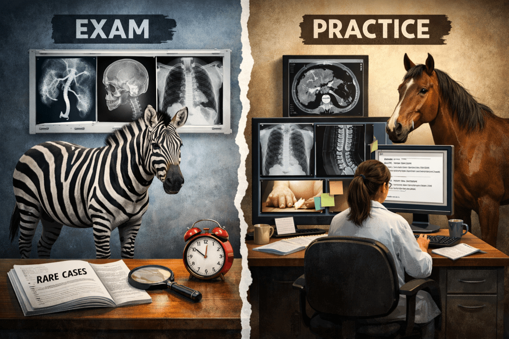 If that is how we practice radiology, why not assess the residents based on this as well? Why have zebras in the exam when we see horses and dogs and cows in actual practice? Certainly, keep some spotters (perhaps 15-20?) for the less common Aunt Minnies, and definitely keep DICOM based long and short cases. But why not also have a ‘daily chest’ of cases, which can be normal and also the garden variety of regular practice. Give 10-20 such cases to each examinee (including normals), give them sufficient time to type their findings and impression, and evaluate them based on the same. This will ensure that residents focus on knowing the basics rather than only on the rare entities and syndromes; that they read about MRI of degenerative spine more than about the findings of myxopapillary ependymoma.